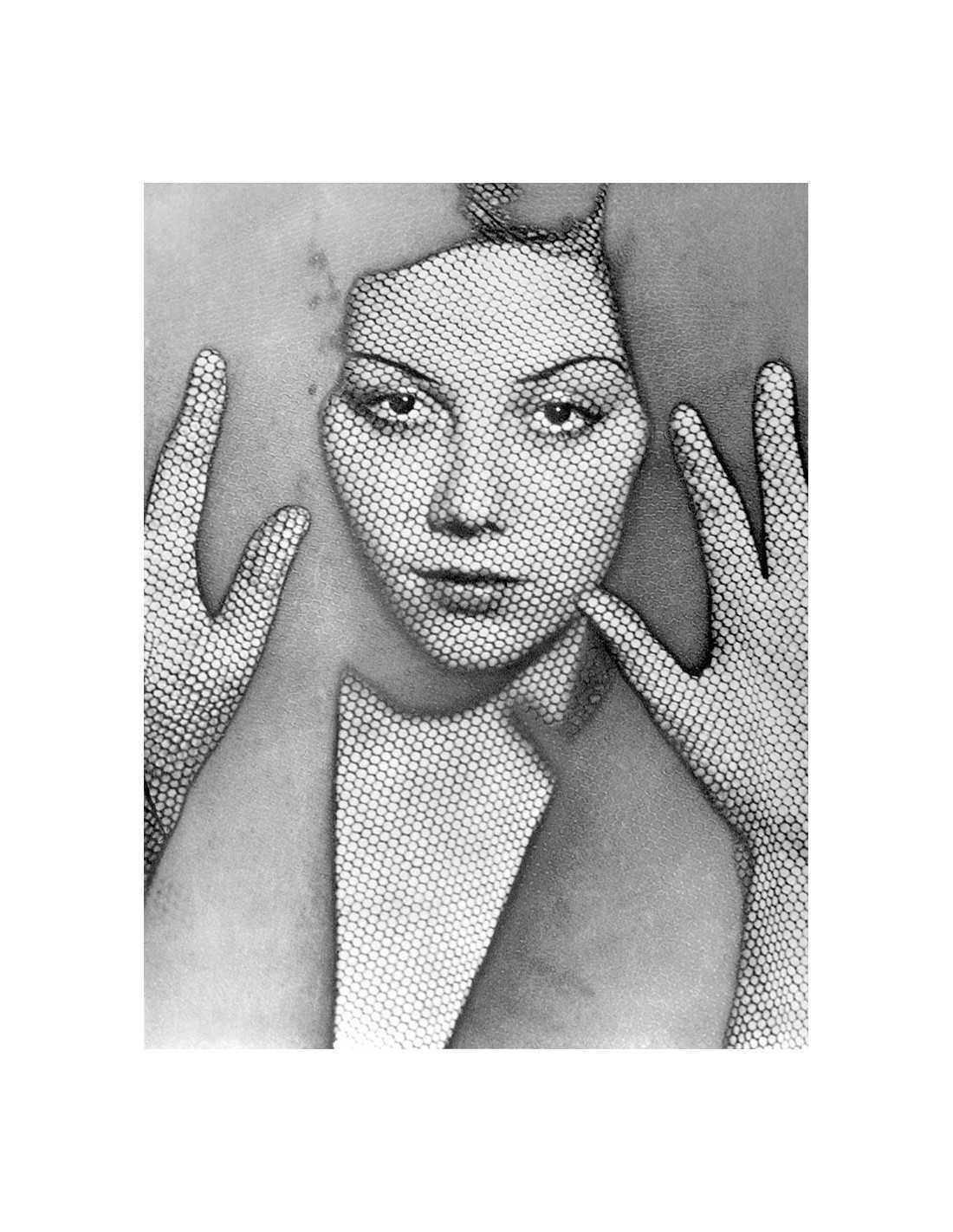 Portrait of a woman with her hands on either side, overlaid with halftone and solarization